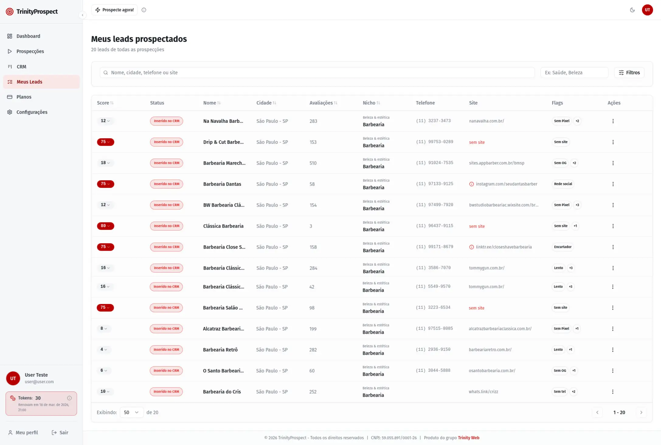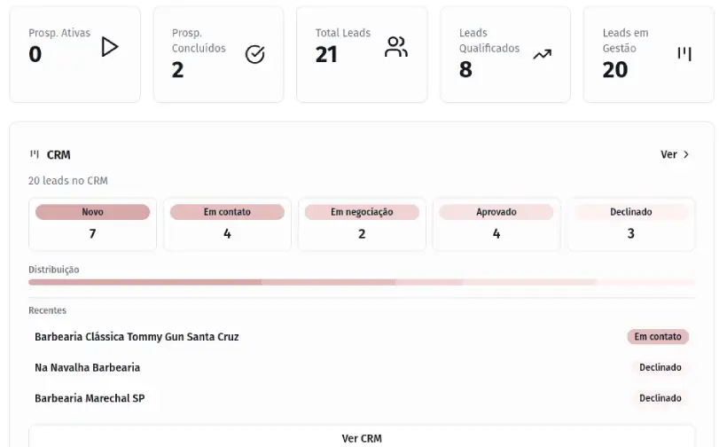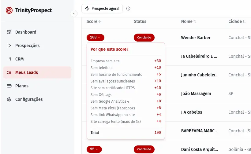 Antes eu perdia horas buscando lead manualmente. Agora configuro nicho e região, rodo a prospecção e em pouco tempo tenho lista qualificada. O score dos leads mudou nossa taxa de conversão.