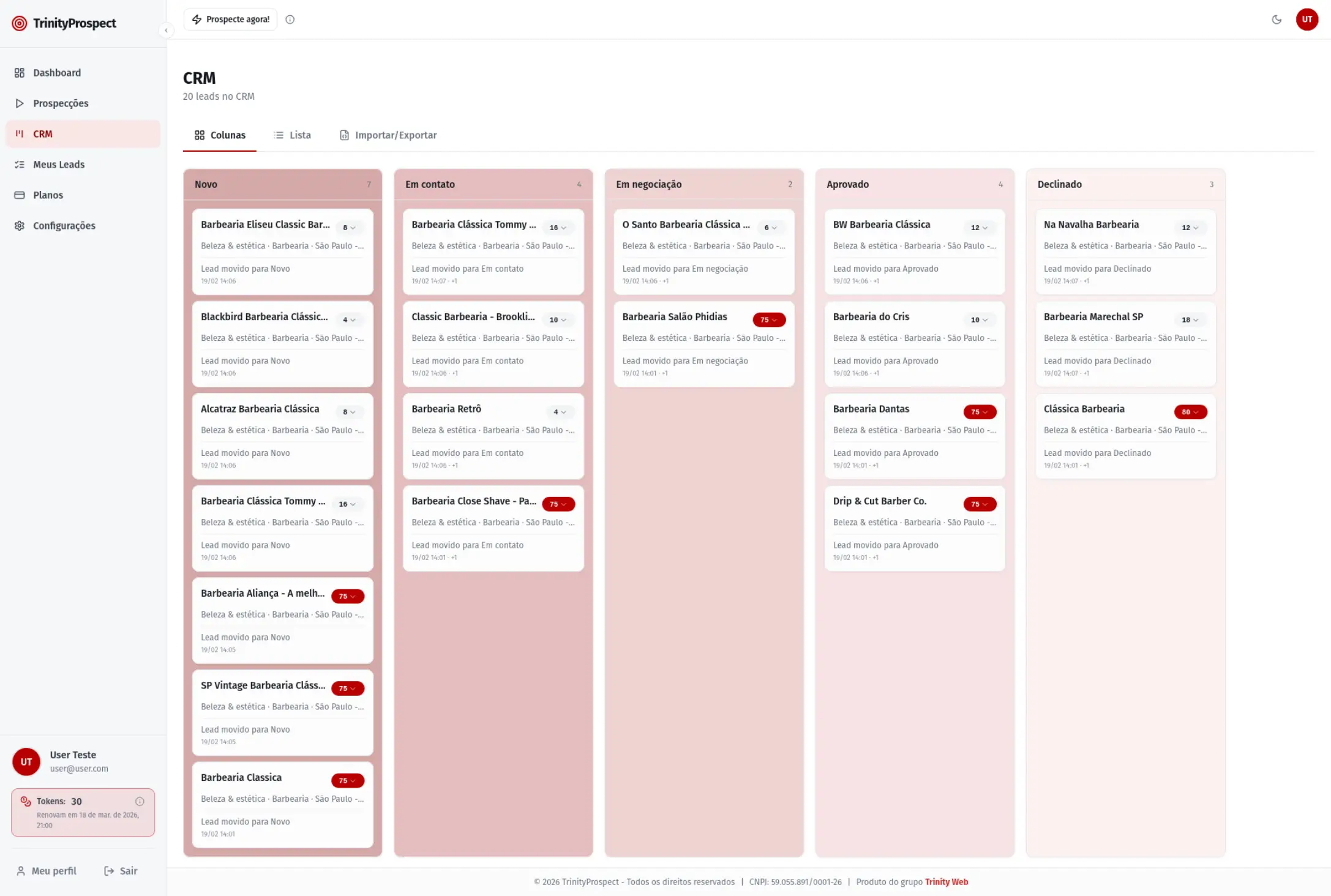Acompanhe o saldo de tokens, prospecções ativas e concluídas, total de leads e qualificados. Veja o resumo do pipeline e o uso do mês em um só lugar.