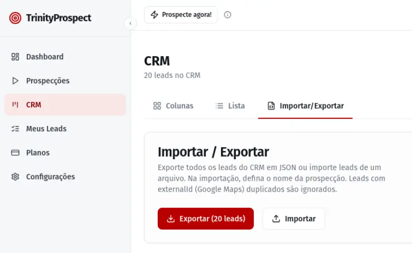 Na listagem de uma prospecção concluída ou em "Meus Leads", use a opção de exportar. Você escolhe quais colunas incluir (nome, cidade, telefone, site, score etc.) e baixa em planilha para usar em campanhas, CRM externo ou envio para sua equipe.