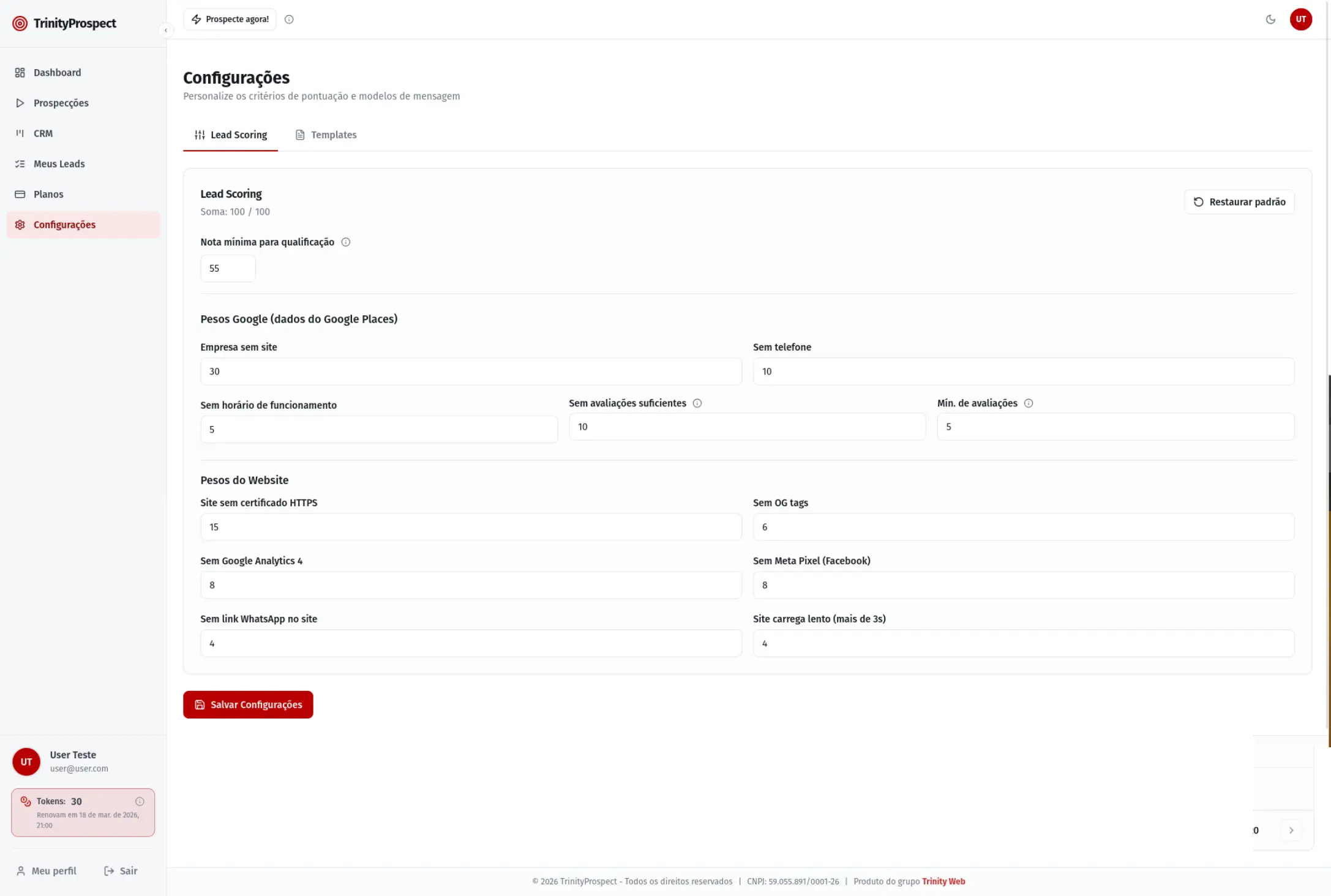 Cada lead recebe uma nota de 0 a 100 com base em dados como telefone, e-mail, site e outras informações. A plataforma já vem com um valor base de pesos; você pode manter ou ajustar os pesos de cada critério nas configurações. Além disso, define a nota mínima de qualificação e pode ordenar e filtrar leads por score para priorizar os melhores contatos.