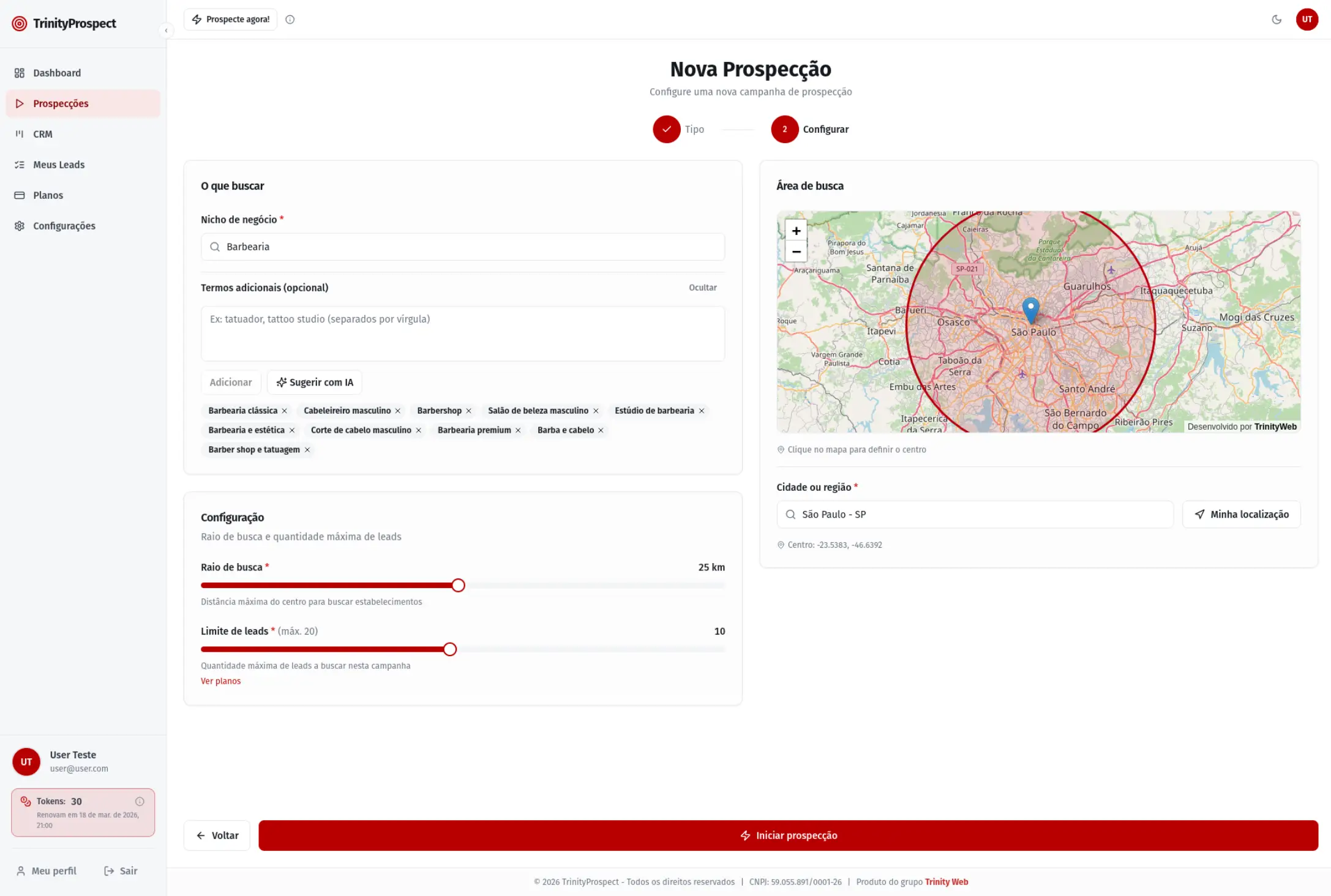 Você escolhe o nicho (ex.: barbearia, restaurante), a cidade ou região e o raio de busca em km. No mapa, define o centro da área. A plataforma busca estabelecimentos nessa região, aplica auditoria e lead scoring e entrega a lista de leads para você filtrar, exportar ou enviar ao CRM.